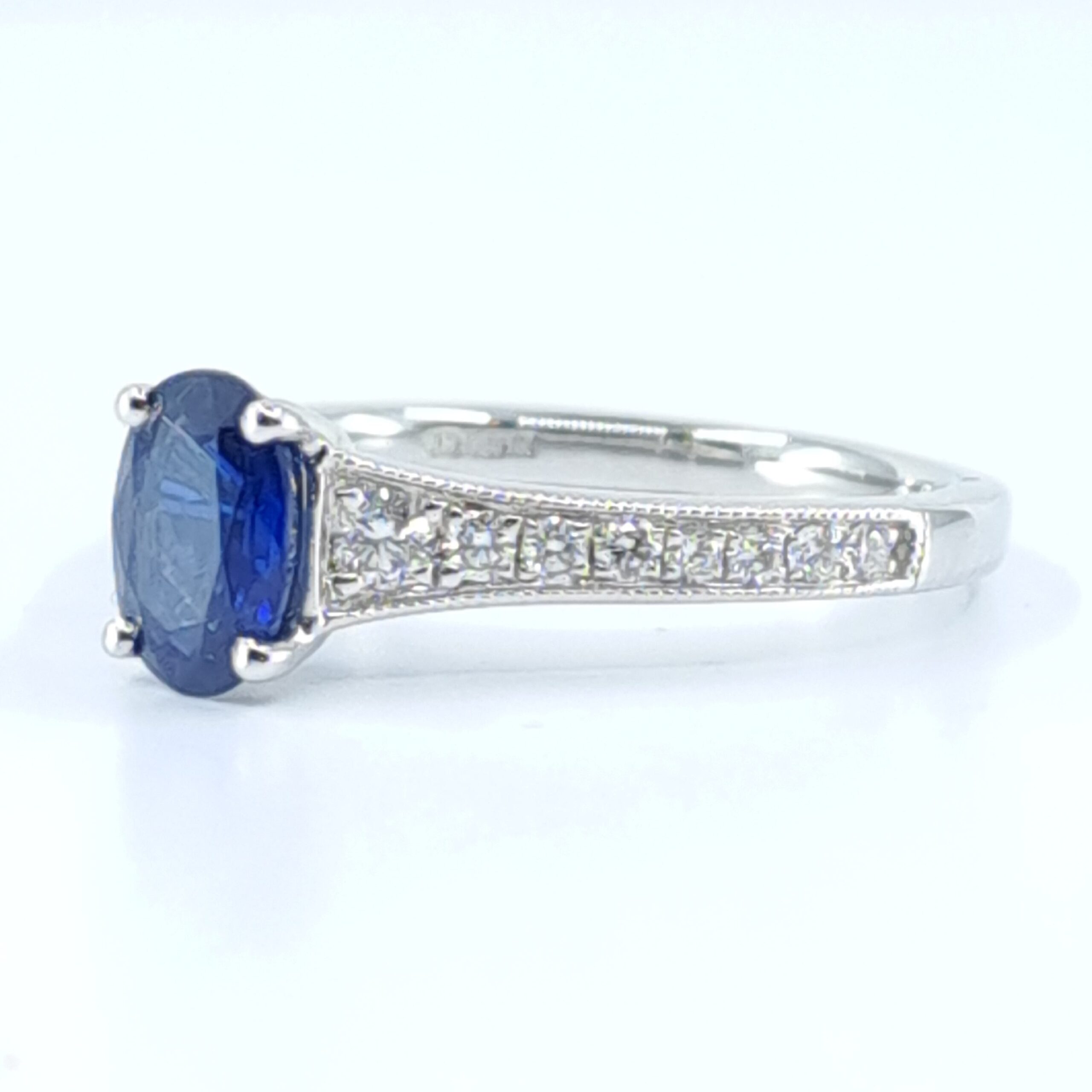 Art Deco Style 18K White Gold Sapphire Ring – 0.83ct Oval Sapphire & 0.30ct Brilliant Diamond Side Stones