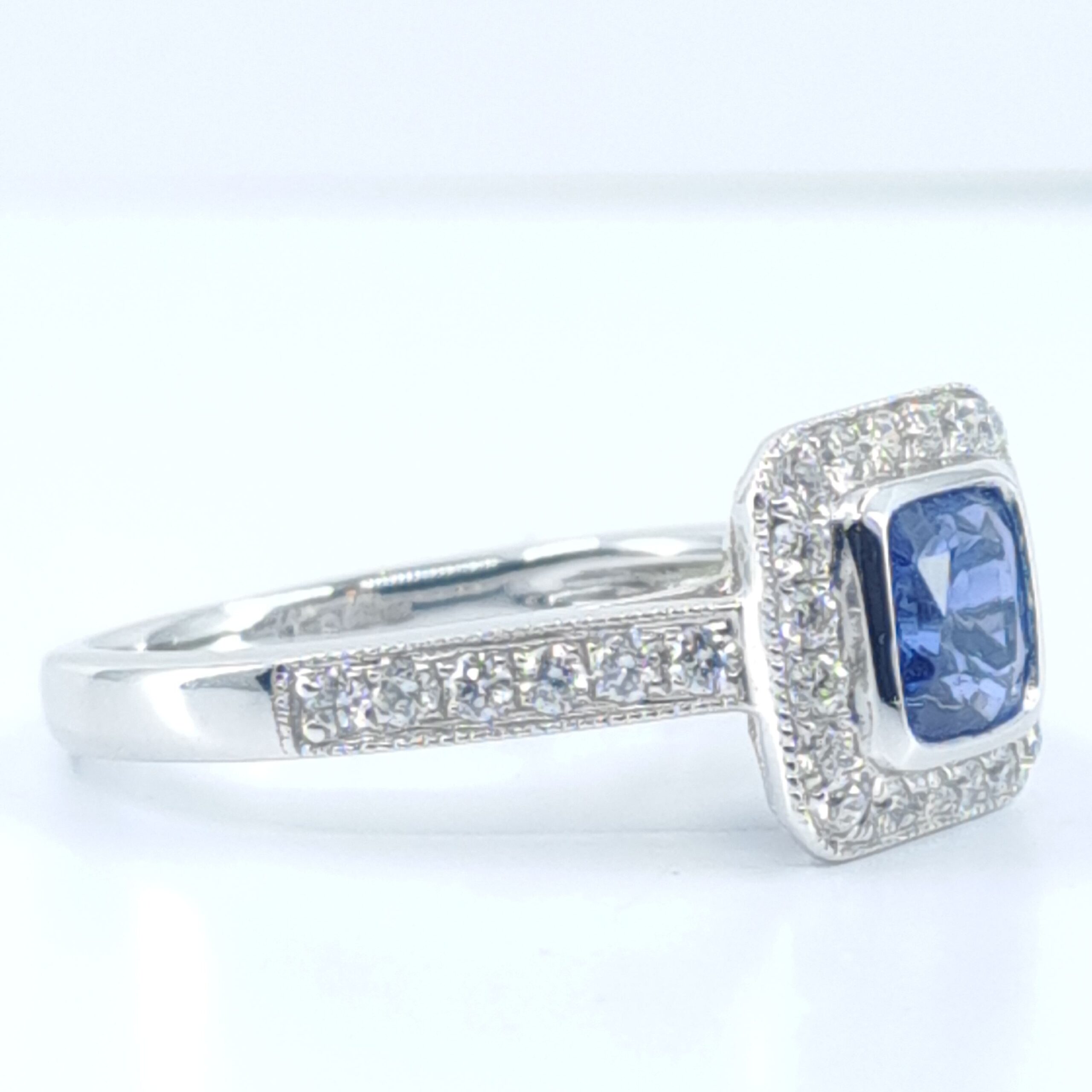 This elegant 18K white gold ring features a vibrant 1.15ct cushion-cut sapphire surrounded by a sparkling halo and side stones with 0.65ct of round diamonds in D–E color and VVS clarity. A timeless and luxurious piece, perfect for fine jewelry lovers or as a special gift.