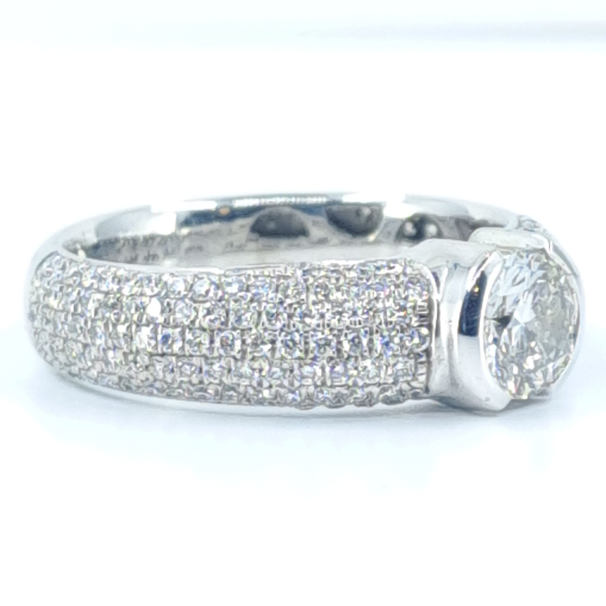 This luxury 18K gold diamond ring showcases a brilliant 0.63Ct F VS2 center diamond paired with 1.80Ct pavé-set diamonds on the shoulders for maximum sparkle. A perfect engagement ring, anniversary ring, or fine jewelry piece for those who love classic, high-quality diamond design.