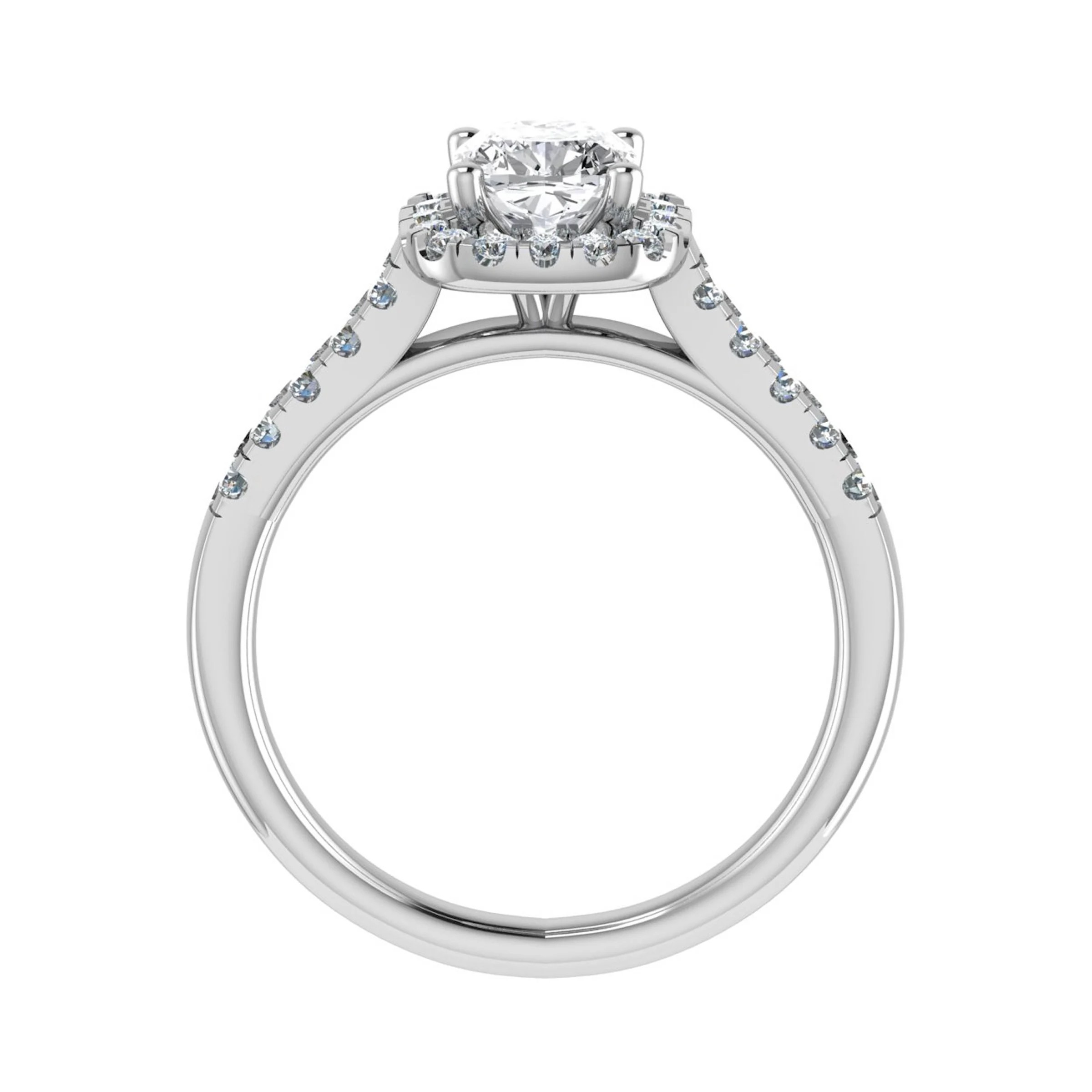 Ring in 18K white gold, set with a cushion diamond of 0.70 ct, E SI1, and with round diamonds around the main stone and on the sides, total weight of 0.40 ct.