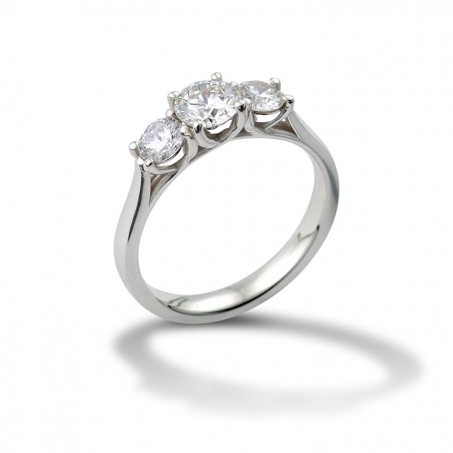 Modern trilogy where the center stone is slightly bigger and higher accompanied by proportionate calibrated side stones to achieve a great effect. A three stone ring can be used as an engagement ring or as a symbolic jewel for a new child.